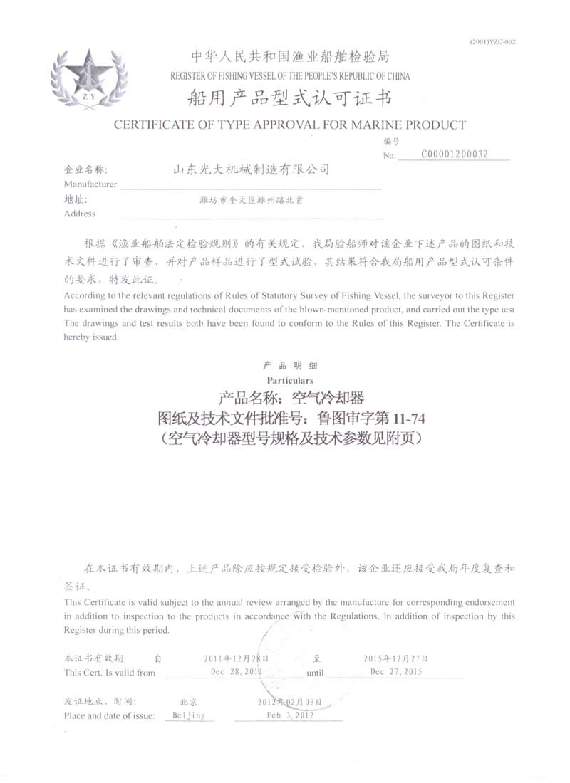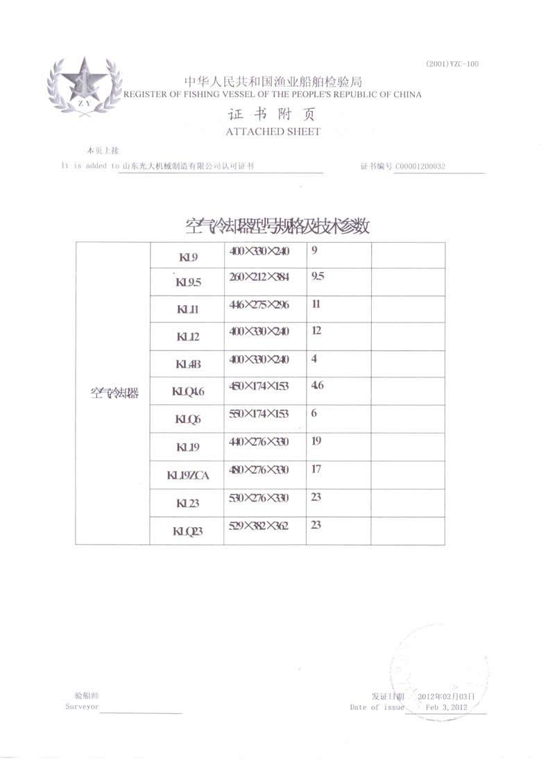 空氣冷卻器-船用產(chǎn)品型式認(rèn)可證書